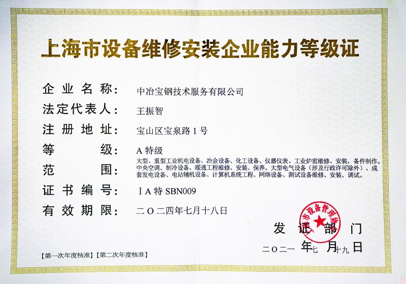 上海市设备维修安装企业能力等级证(A特级)
